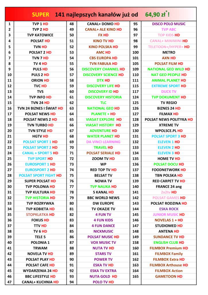 Kanały pakietu telewizyjnego firmy Telsat.tv – Pakiet Super